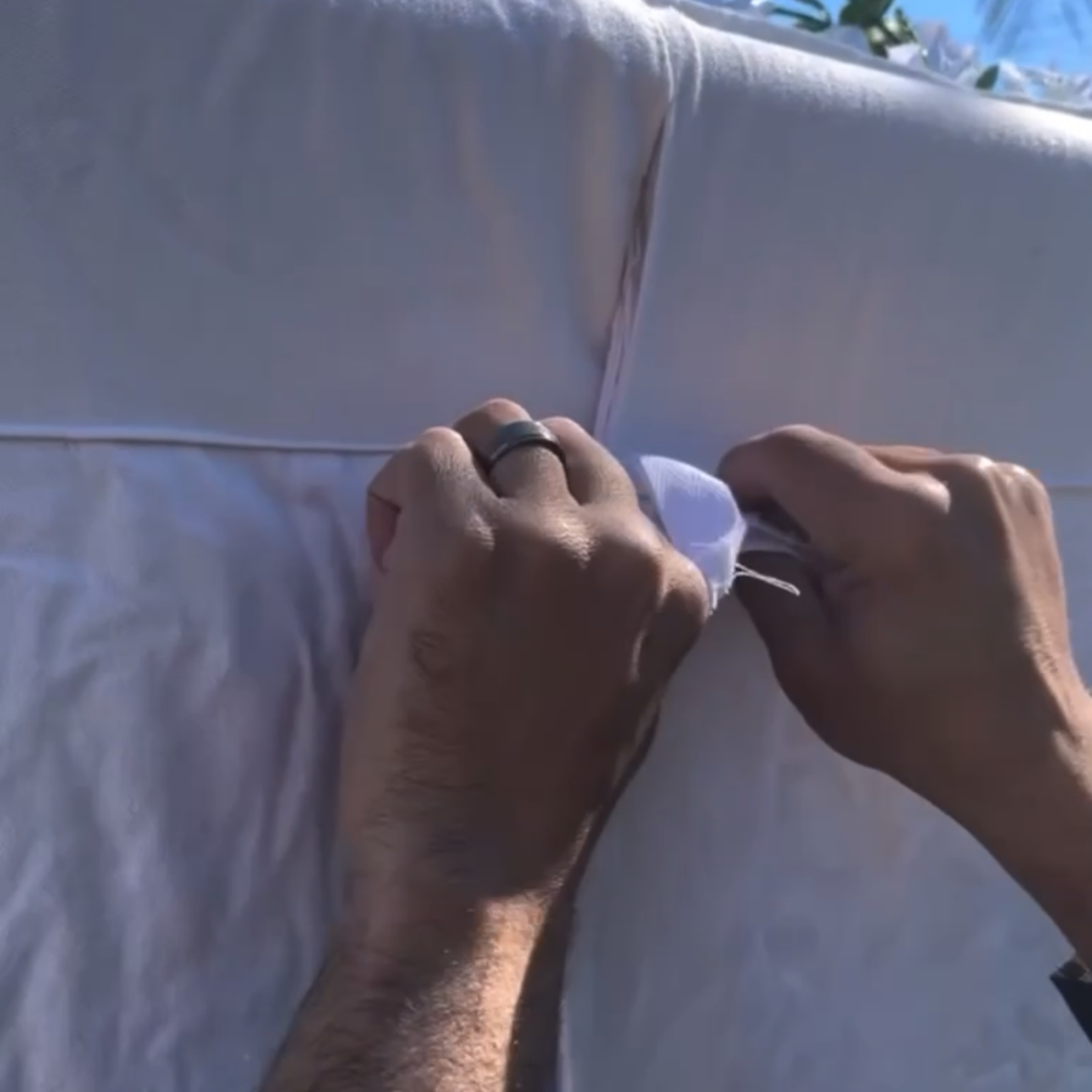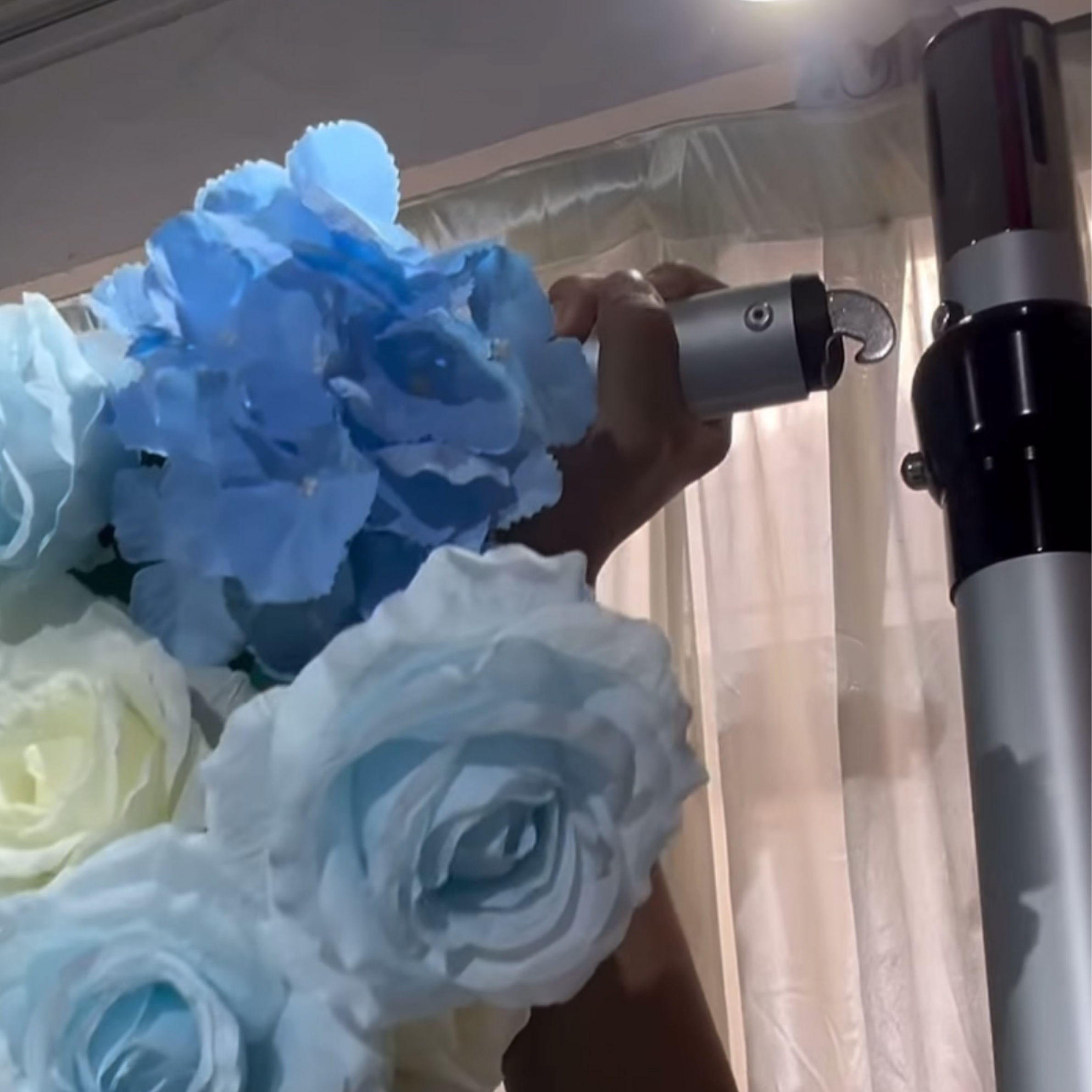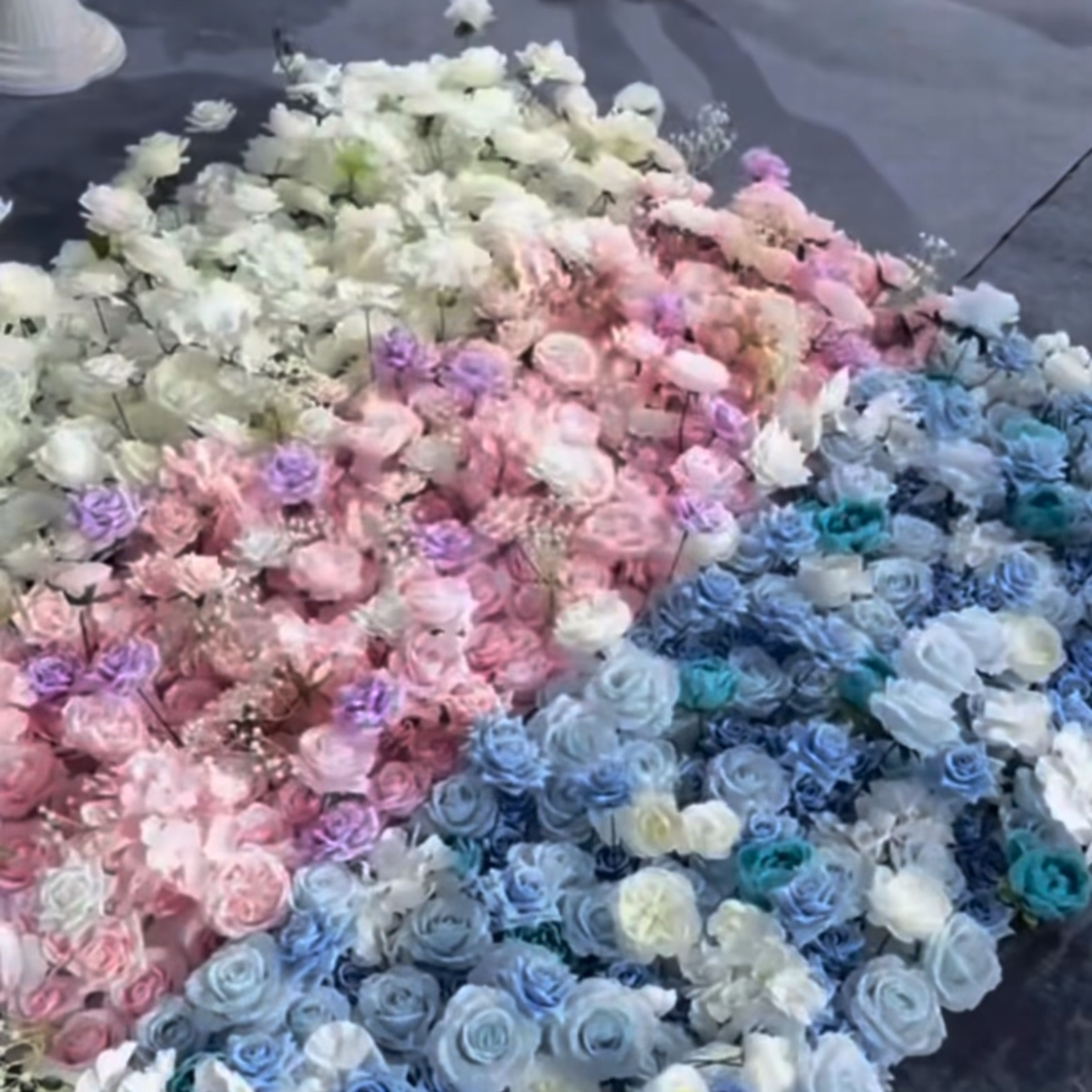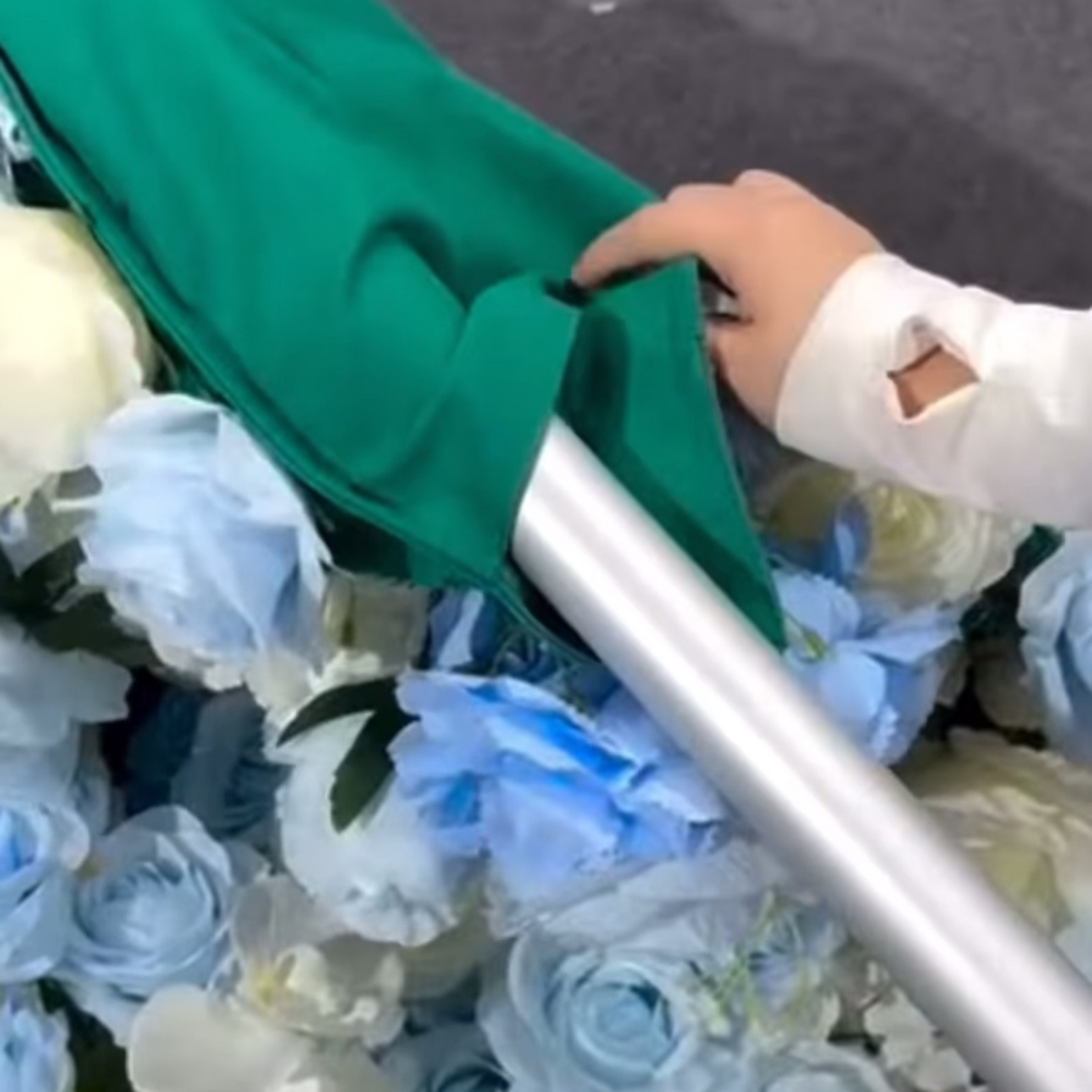 Unroll all Flower Wall panels face up on the floor. Place them side by side in the same direction, with the rod pocket positioned at the top.